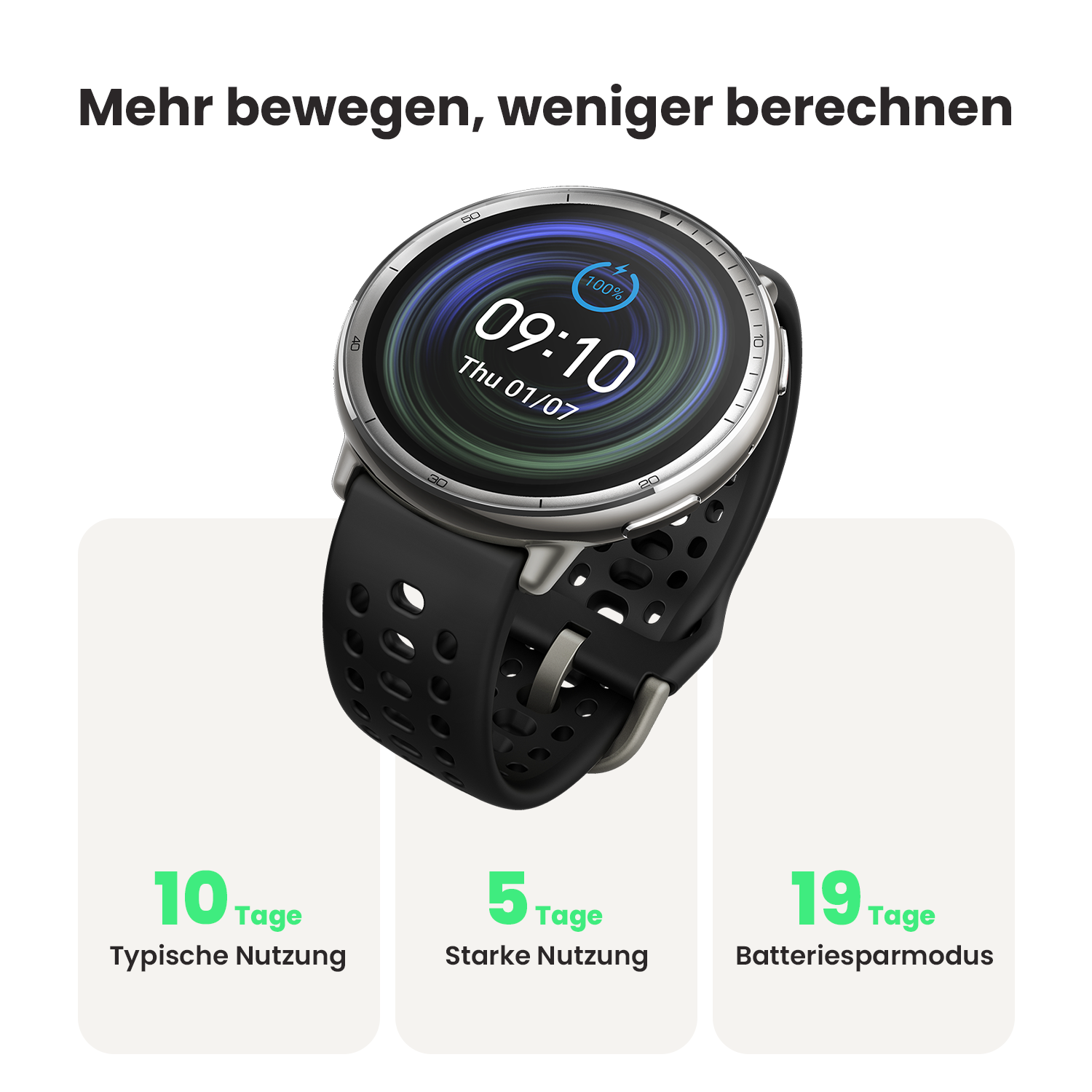 - Batteriesparmodus Akkulaufzeit: Bis zu 19 Tage