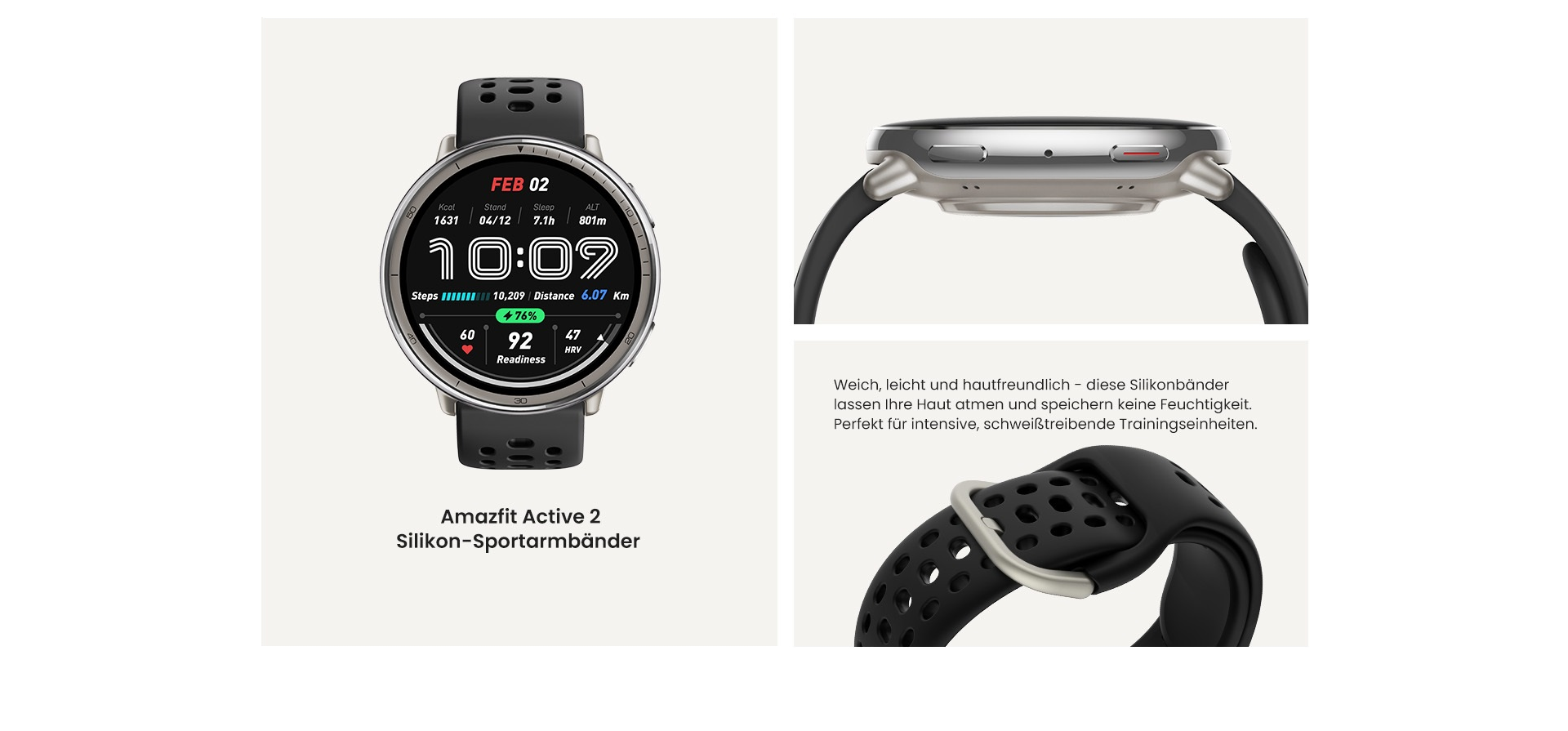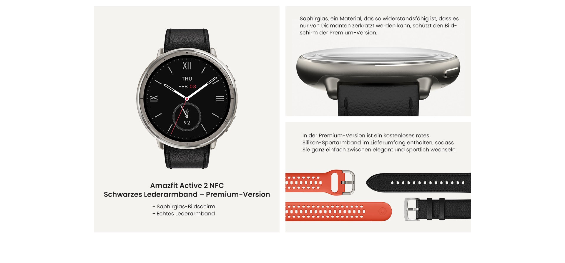 - Farben: Schwarzes Leder – Premium-Version, Rotes Sport-Silikon, Schwarzes Sport-Silikon