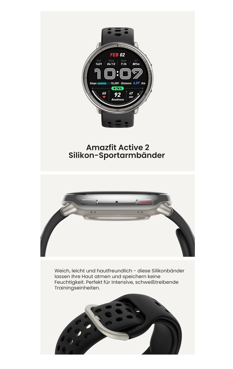 5. Gemäß der Norm ISO 22810:2010 erreicht die Amazfit Active 2 (Round) eine Bewertung von 5 ATM, also eine Wasserdichtigkeit von bis zu 50 Metern, und ist daher für Spritzwasser, Schnee, Duschen oder Schwimmen geeignet. Sie hat die von SGS durchgeführten Tests durch Dritte bestanden und die Berichtsnummer lautet SHES241102180871. Nehmen Sie die Uhr ab, wenn Sie eine heiße Dusche nehmen oder in die Sauna gehen, da zu viel Dampf die Dichtung beeinträchtigen und sie in Zukunft weniger wasserdicht machen kann. Tragen Sie die Uhr beim Schwimmen nicht mit einem Leder- oder Metallarmband - wechseln Sie bei der Vorbereitung zum Schwimmen zu einem Silikonarmband oder einem anderen geeigneten Typ. Verwenden Sie zum Reinigen der Uhr keine Reinigungsmittel wie Seife, Handdesinfektionsmittel, Duschgel oder Lotion, da chemische Rückstände die Haut reizen und das Gerät angreifen können, was möglicherweise die Wasserdichtigkeit beeinträchtigt. Bei versehentlichem Kontakt spülen Sie die Uhr sofort mit klarem Wasser ab, lassen Sie sie 30 Minuten lang einweichen, nehmen Sie sie dann heraus und wischen Sie sie mit einem sauberen, weichen Tuch trocken. Weitere Informationen finden Sie auf der Support-Seite unter: support.amazfit.com