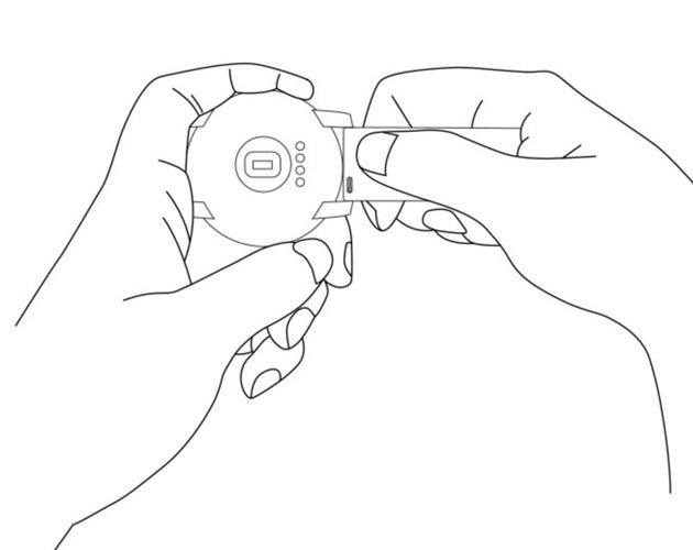 Drücken und halten Sie den Stift des Federstegs und drücken Sie dann in die entgegengesetzte Richtung. Richten Sie den anderen Stift auf die Öse an der Innenseite der anderen Aufnahme aus und lassen Sie ihn los.