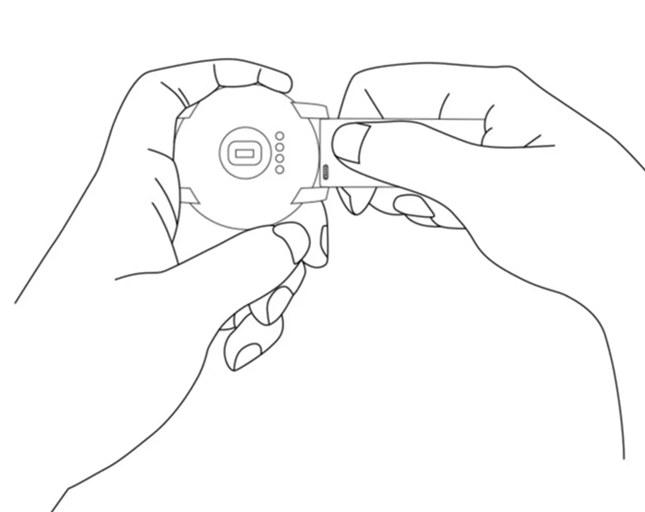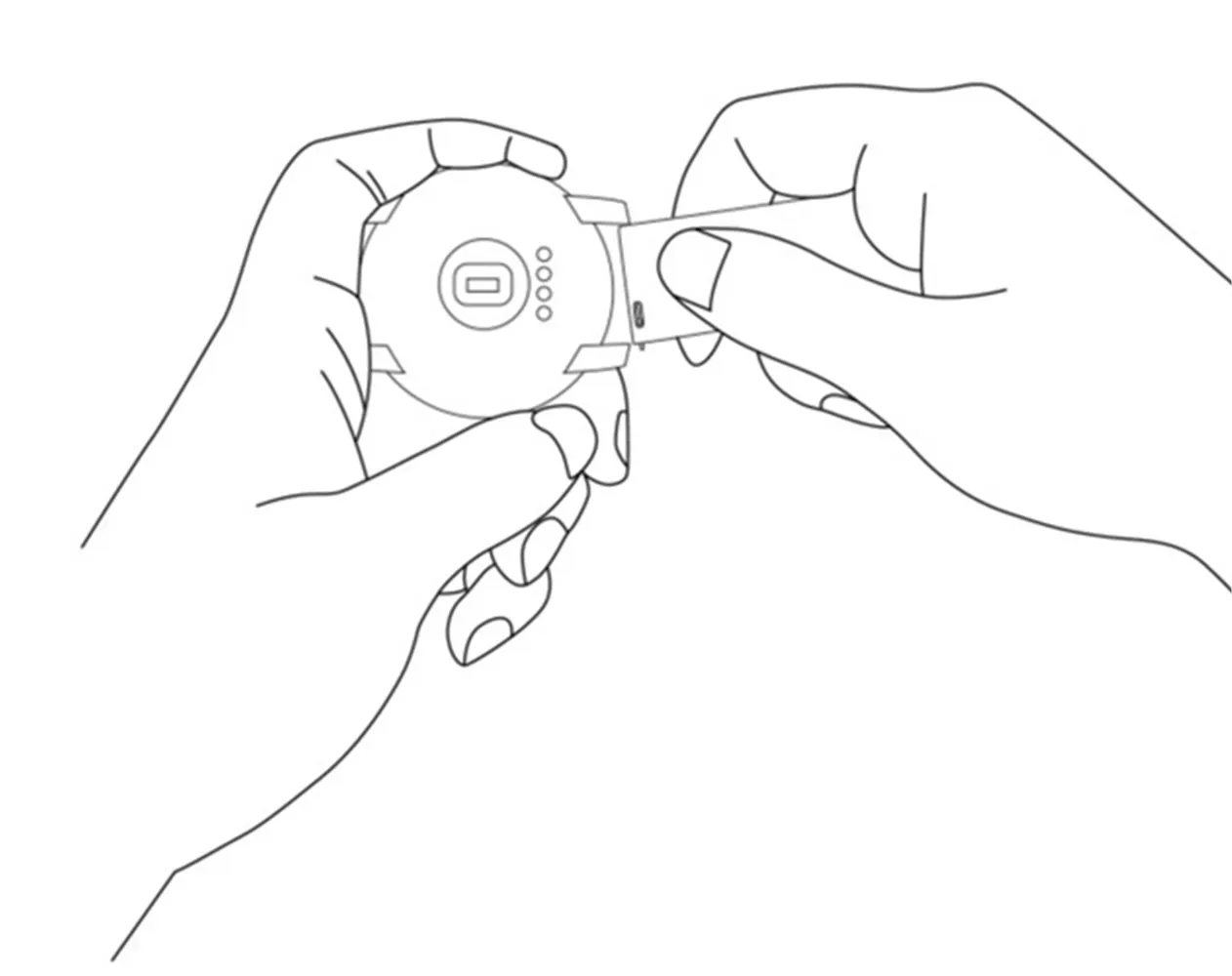 Halten Sie die Uhr mit der linken Hand und stecken Sie den Federsteg, der am weitesten vom Schalter entfernt ist, in das Loch an der Innenseite der Aufnahme.