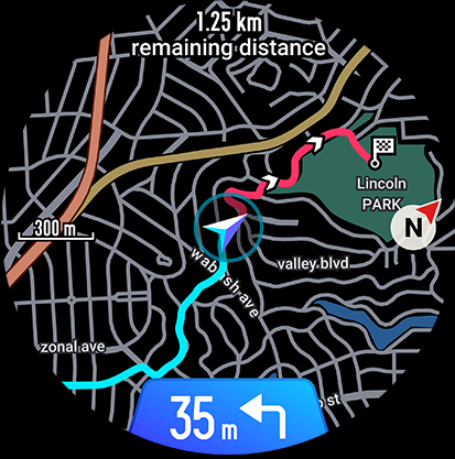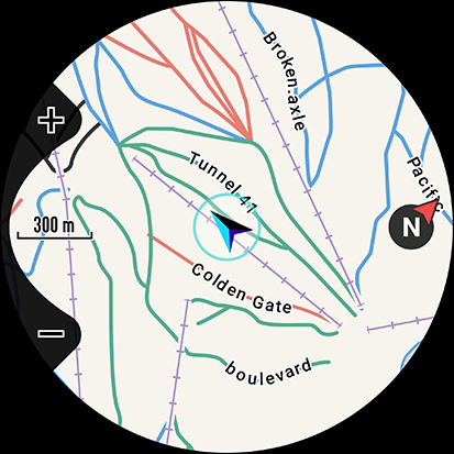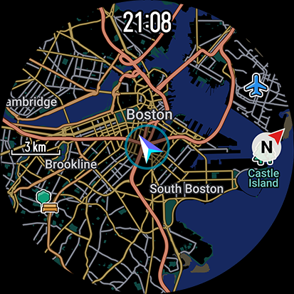 - Die Karte auf der Seite der Uhr unterstützt die Anzeige von Point-of-Interest-Informationen, wie Geschäfte, Krankenhäuser, Toiletten, Stadien und andere geografische Kennzeichnungen.