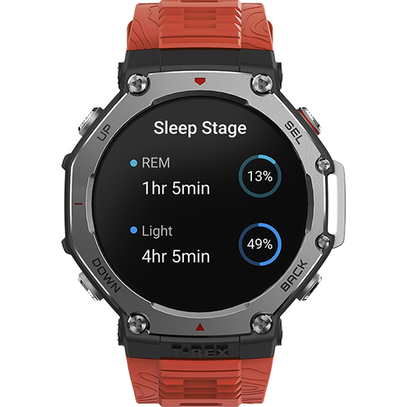 Überwachen¹⁵ Sie Ihre Schlafphasen, die Qualität der Atmung im Schlaf und Ihr Nickerchen am Tag und erhalten Sie jeden Morgen Ihren Schlafwert in der Zepp-App. -