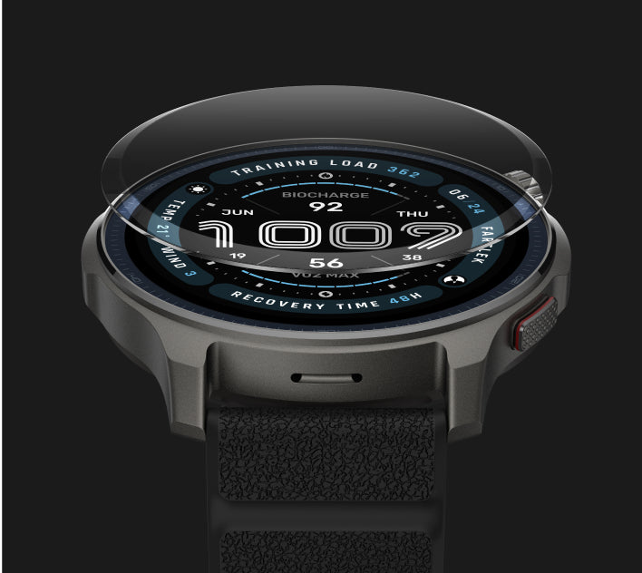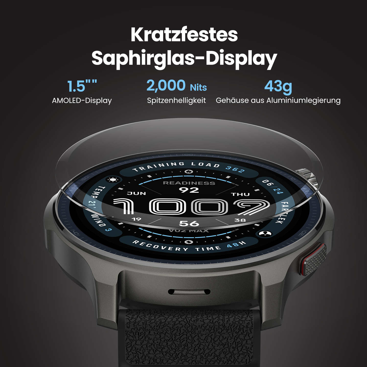 Das schlanke Aluminiumgehäuse und der 1,5 Zoll große, robuste Bildschirm aus Saphirkristallglas bieten ein hochwertiges, robustes Design, während die Doppellautsprecher während des Trainings klare Audiosignale liefern. Stil trifft auf Funktion, damit Sie konzentriert bleiben und die Kontrolle behalten.