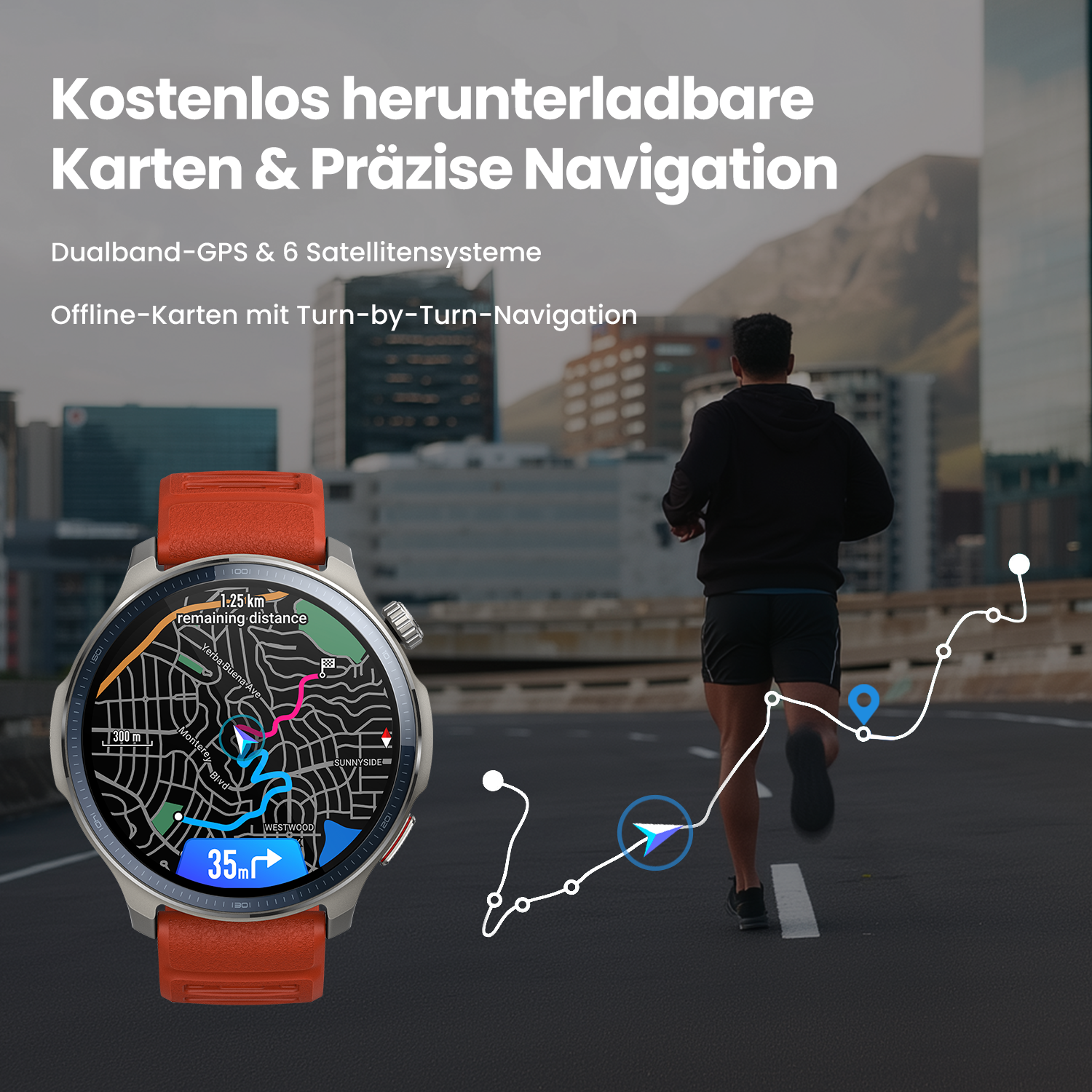 Verfolgen Sie jede Ihrer Bewegungen präzise, selbst unter hohen Gebäuden oder Bäumen. Die Dualband-Unterstützung von sechs Satellitensystemen⁹ sorgt für eine schnelle und zuverlässige Verbindung.