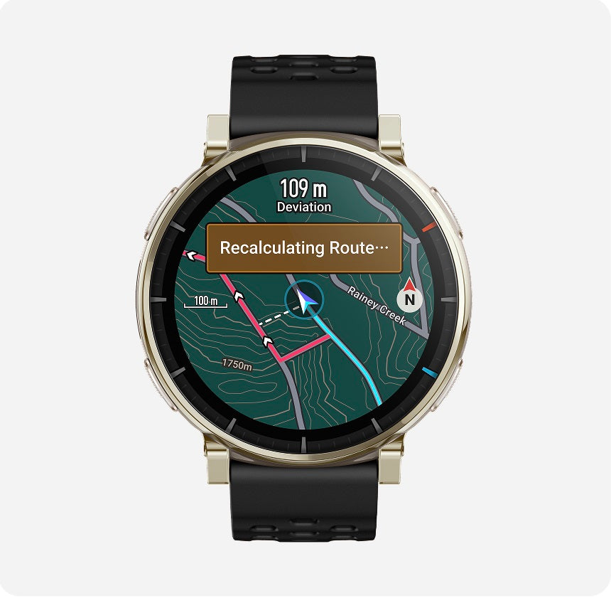 Legen Sie Ihre Zieldistanz und -richtung fest, und Ihre Uhr erstellt automatisch optimierte Hin- und Rückrouten, berechnet automatisch den besten Weg zu jedem beliebigen Ort und verwendet Routen, die Sie in der App geplant haben.