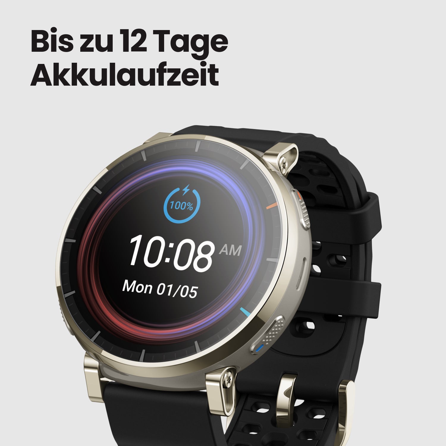 Typisches Nutzungsszenario: Standard-Bildschirmhelligkeit, statisches Zifferblatt, Sprachassistent deaktiviert; 24/7 Tragen/Herzfrequenzmessung permanent aktiv (alle 5 Minuten )/unterstützte Schlafüberwachung/Überwachung der Schlaf-Atemqualität (8 Std./Tag)/Stressüberwachung ; Wöchentlich: 15 Min. Bluetooth-Anrufe, 30 Min. Musikwiedergabe, 90 Min. GPS-Aktivität; Täglich: 100 Aktivierungen durch Anheben des Handgelenks, 150 Benachrichtigungen (Bildschirm aus), 3 eingehende Anrufe, 4 NFC-Zahlungen, 5 Min . Interaktion mit eingeschaltetem Bildschirm.
