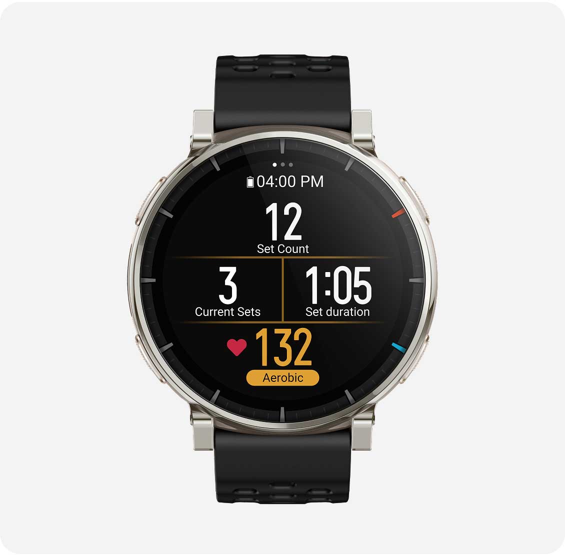 15. Die intelligente Erkennung von Krafttrainingsübungen ist nur im Krafttrainingsmodus verfügbar. Zum Zeitpunkt der Produkteinführung werden 25 Übungen erkannt, darunter: Kniebeugen mit dem eigenen Körpergewicht, Frontkniebeugen mit gestreckten Armen, Kniebeugen mit der Langhantel, Trizepsdrücken am Kabelzug, vorgebeugtes Rudern, Bankdrücken mit der Langhantel, Sit-ups (Halten), Sit-ups mit Knieberührung, Kurzhantel- Fliegende , Burpees, Burpee-Sprünge, Trizepsdrücken über Kopf , Trizepsdrücken im Liegen, Seitheben , Hampelmänner, Latziehen, Kreuzheben, Liegestütze , Schulterdrücken, Klimmzüge, Bizepscurls, Rudern am Kabelzug im Sitzen, Kurzhantel-Zugcurls, Latziehen mit gestreckten Armen und Russian Twists. Wird eine Übung von der Uhr nicht automatisch erkannt, bietet die Zepp- App eine Liste mit Muskelgruppen oder Übungsnamen zur Auswahl an.