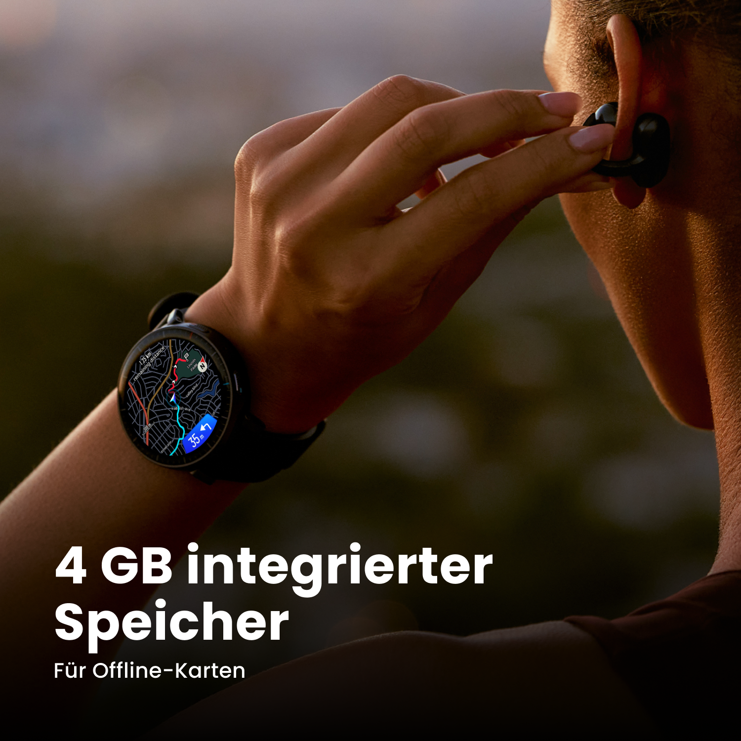 Laden Sie Geländekarten und Skikarten direkt auf Ihre Uhr herunter, um offline zu navigieren – ganz ohne Mobilfunkempfang. Die integrierte Positionsbestimmung mit fünf Satellitensystemen⁵ garantiert schnelle und präzise Ortung überall.