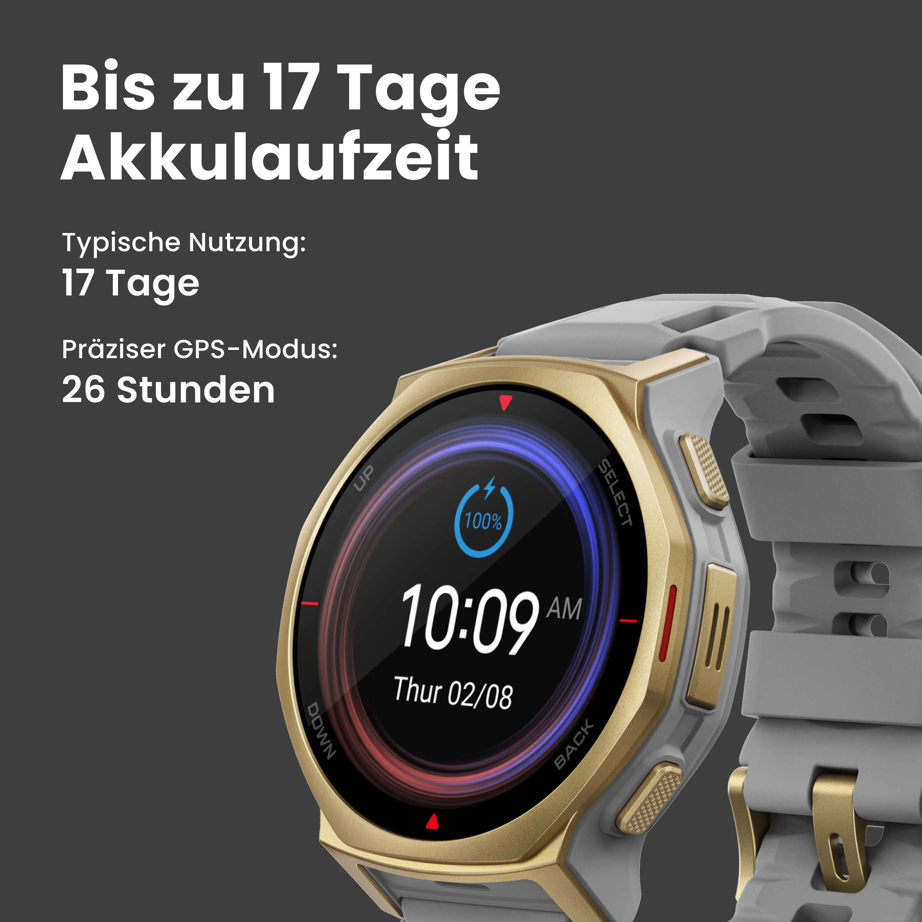| Typische Akkulaufzeit | Bis zu 25 Tage | Bis zu 17 Tage | Bis zu 27 Tage |